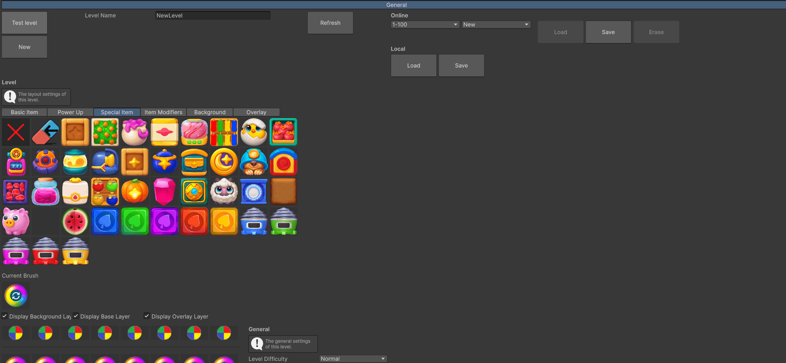 Visual Grid Painter: Implemented a "brush" system that allows designers to select items from a palette (Basic Items, Special Items, Modifiers) and paint them directly onto the level grid.