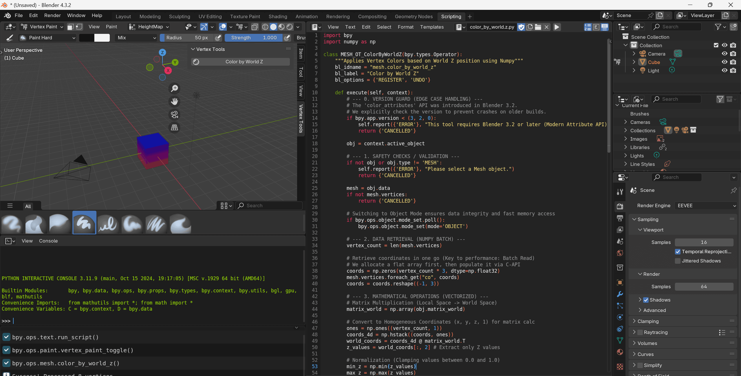Challenge: Processing mesh data in Python is typically slow. Looping through thousands of vertices to apply colors based on spatial coordinates creates significant lag in Blender.